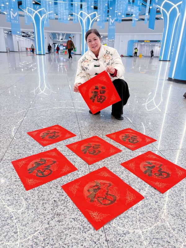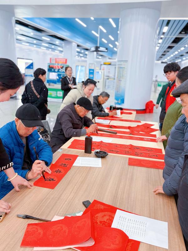 往来乘客纷纷驻足,或静心等候,或驻足观赏,脸上洋溢着喜悦的笑容。不少归乡旅客特意放慢脚步,排队领取这份饱含心意的墨宝,有的乘客还与书法家交流,定制专属对联。拿到对联的乘客们小心翼翼地折叠收好,言语间满是感激:“地铁和社区太贴心了,这手写的对联比买的更有年味儿,带着它回家,旅途都更温暖了。”