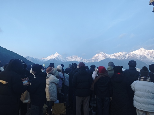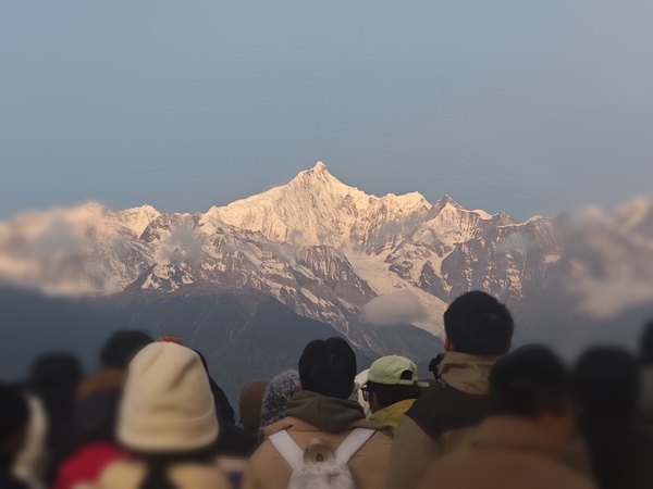 前一天,我们原本计划上山,却刷到网上满是吐槽:“等了一上午,云层厚得像棉被,卡瓦格博连影子都没见着。”犹豫之下,我们临时取消了行程,却在心里埋下了遗憾的种子。天气预报说今天有80%的概率是多云,出发时我心里也打着鼓,可当车拐过最后一道弯,看到观景台上已经攒动的人群时,忽然就懂了——总有人愿意为一场不确定的日出,赌上一整个清晨的寒冷。
