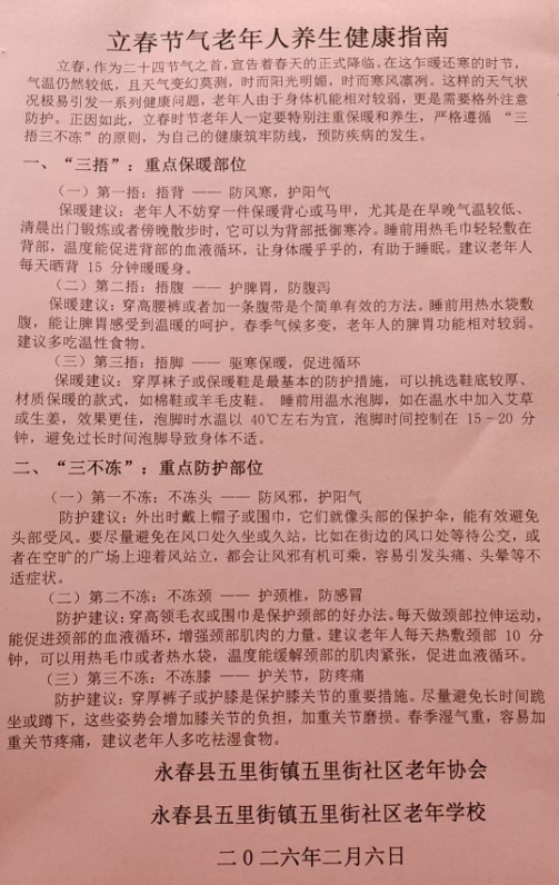 永春县五里街社区老年协会会长、副会长一行正在走访、慰问高龄老人 农历马年春节还未到,作为二十四节气之首的立春节气已于2月4日来到了。立春,宣告着春天的正式降临,当第一缕春风轻柔拂过,大地开始焕发出勃勃生机。然而,在这乍暖还寒的立春时节,气温仍然较低,且天气变幻莫测,时而阳光明媚,时而寒风凛冽。特别是近日寒潮来袭,永春区域气温骤降,这样的天气状况极易引发一系列健康问题,老年人由于身体机能相对较弱,更是需要格外注意防护。五里街社区老年协会注意到立春节气的天气特点,适时会同社区老年学校编写了《立春节气老年人养生健康指南》。《指南》从“三捂三不冻”的独特视角,详细剖析立春养生的关键要点。一是要做到“三捂”,对重点保暖部位要捂背,以防风寒,护阳气;捂腹,以护脾胃,防腹泻;捂脚,以驱寒保暖,促进循环。二是要做到“三不冻”,对重点防护部位的第一不冻,是不冻头,防风邪,护阳气;第二不冻是不冻颈 ,护颈椎,防感冒;第三不冻是不冻膝 ,护关节,防疼痛。《指南》还详细提出了通俗易懂、简单易行的“三捂”保暖建议和“三不冻”的防护建议。根据五里街社区老年人活动中心场所由于五里古街“海丝原点”景区旅游配套基础设施建设项目需要而拆迁,目前正处于拆迁过渡期,无法开展大型宣传活动的实际惰况,社区老年协会、社区老年学校于2月6日在线上通过微信,将《立春节气老年人养生健康指南》发布在社区老年协会联系群和社区老年人工作(活动)群供老年人阅读和学习。并发出通知,要求社区老年协会、社区老年学校的骨干认真阅读《指南》,并要怀着关爱老人之心,采用各种各样的方式向老年人宣传立春节气老年人养生健康知识,以助力老年人健健康康地度过春季。