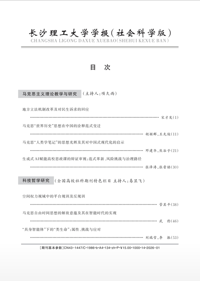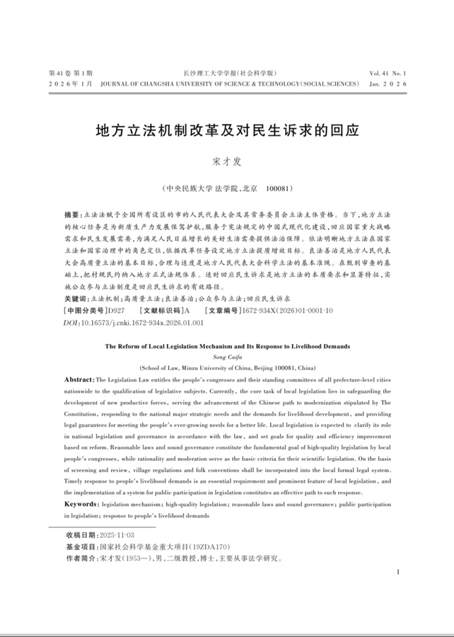 发表时间:2026-02-25 11:14来源:中国文旅传媒网 北京2月25日电 立法法赋予全国所有设区的市的人大及其常委会立法主体资格。当下,地方立法的核心任务是为新质生产力发展保驾护航,服务于宪法规定的中国式现代化建设事业,回应国家重大战略需求和民生发展需要,为满足人民日益增长的美好生活需要提供法治保障。依法明晰地方立法在国家立法和国家治理中的角色定位,依据改革任务设定地方立法提质增效目标。良法善治是地方人大高质量立法的基本目标,合理与适度是地方人大科学立法的基本准绳,在甄别审查的基础上把村规民约纳入地方正式法规体系,适时回应民生诉求是地方立法的本质要求和显著特征,实施公众参与立法制度是回应民生诉求的有效路径。由长沙理工大学主管、主办的全国高校社科优秀期刊、中国人文社会科学期刊AMI核心期刊、RCCSE核心学术期刊(A)、湖南省社会科学基金资助期刊《长沙理工大学学报》(社会科学版),2026年第1期首篇发表宋才发教授《地方立法机制改革及对民生诉求的回应》论文。《长沙理工大学学报》(社会科学版)主编彭新宇,论文责任编辑黄园。