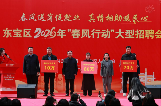 2月27日,农历正月十一,湖北荆门市东宝区2026年“春风行动”大型招聘活动在中天街商业街区盛大开启,本次活动以“春风送岗促就业 真情相助暖民心”为主题,采取“现场招聘+直播带岗+精准服务”的模式,为求职者和用人单位搭建了高效对接平台,现场人头攒动、气氛热烈。 上午10时,“春风行动”启动仪式如期举行。荆门市人社局党组成员、市人才服务局局长全本艳同志出席活动并致辞。仪式现场亮点纷呈,一系列惠企惠民举措集中落地:“荆楚返乡创业项目”正式授牌,湖北矮子馅饼电子商务有限公司获此殊荣;新洋丰农业科技股份有限公司、荆门弘毅电子科技有限公司、诗尼曼家居湖北有限公司等3家企业,现场领取稳岗返还资金共计90万元,有效减轻了企业用工成本;金融赋能环节同样重磅,银行机构为湖北鑫彩服装有限公司、荆门市天辉金属回收有限公司及个体工商户矫燕女士,集中发放创业担保贷款共计760万元,以真金白银为市场主体注入强劲动能。活动中,湖北鑫彩服装有限公司董事长蔡波作为返乡创业代表分享经验,其扎根家乡、带动就业的故事,激励了在场众多游子回乡筑梦、创业兴乡。