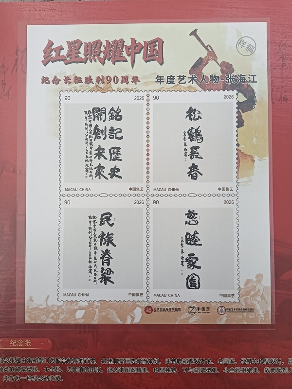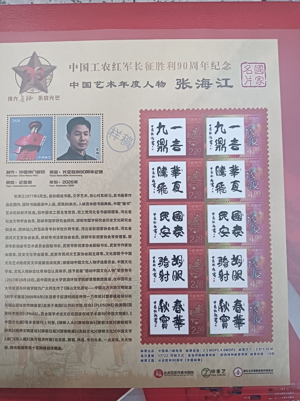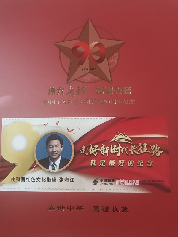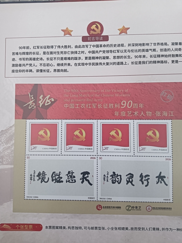 发表时间:2026-03-17 11:31来源:中国文旅传媒网 近日,一则令人振奋的消息从艺术领域传来,武安市张海江的藤书书法作品正式被“中国工农红军长征胜利90周年”主题中国邮册收录,这不仅是他个人艺术生涯的重大突破,更是书法艺术与红色文化完美融合的生动体现。