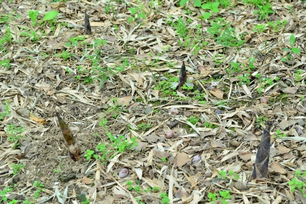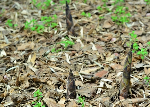 拨开落叶,春笋们争相露头:刚破土的嫩尖裹着薄壳,怯生生惹人怜爱;半尺高的笋子挺拔坚韧,一簇簇相依生长,尽是鲜活气息。